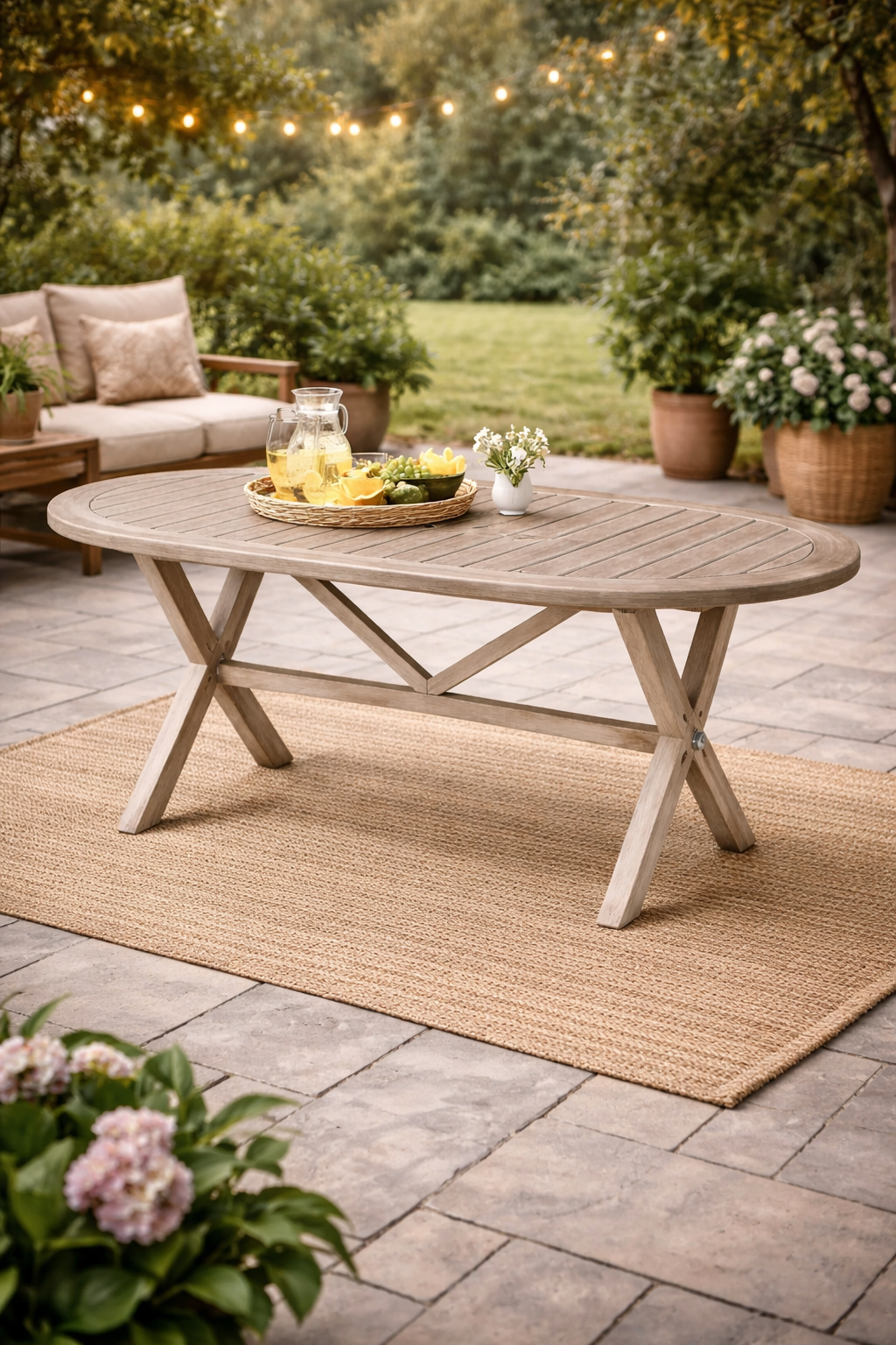 Mesa exterior ovalada de madera clara